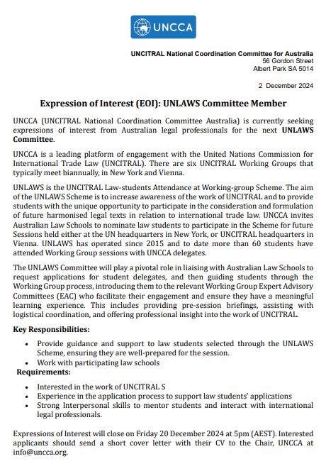 UNCCA: UNCITRAL National Coordination Committee for Australia is currently seeking expressions of interest from Australian legal professionals for the next UNLAWS Committee.