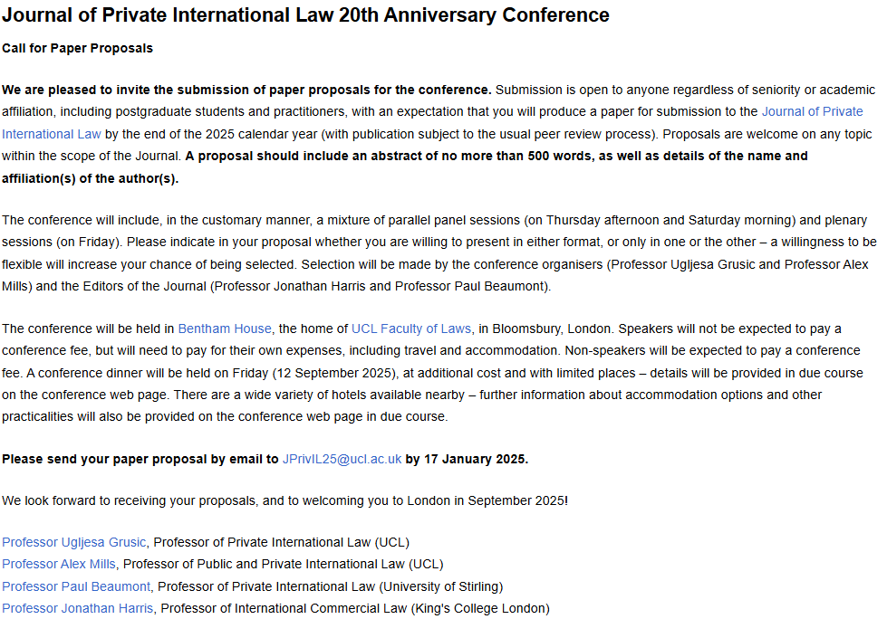 The 20th Anniversay Conference of the Journal of Private International Law is in London this September. Paper proposals are DUE THIS WEEK, 17 January 2025. We hope the Australasian private international law community can make the journey north!